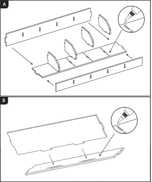 Pour les étagères à compartiments standard (A) : insérez les séparateurs dans la base des étagères. Les tenons sur les diviseurs s’inséreront dans les mortaises de la base. Fixez ensuite les pièces avant et arrière de l’étagère. À chaque étape, appliquez de la colle sur les surfaces à assembler. Répétez l’opération pour chaque étagère.