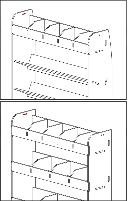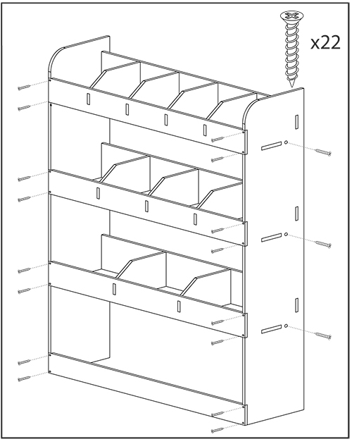 À l’aide des vis fournies avec votre achat, fixez chaque étagère comme indiqué sur le schéma. Veuillez consulter la vidéo ci-dessous pour accéder à l’assemblage complet de l’étagère.